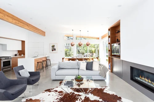 Nestled in the woods on the sloped shores of the Mamquam River, this house was designed with privacy and tranquility in mind. The owners, who work from home, wanted an office space that felt connected to both the main living areas and the beautiful surroundings. A 3-sided courtyard achieves this, while a west-coast interior palette of natural wood textures, heated concrete floors, and sliding glass walls ensures a similar connection to nature for the rest of the house. The separation between private and public spaces also makes the house perfect for entertaining guests, whether for an evening or a week-end.