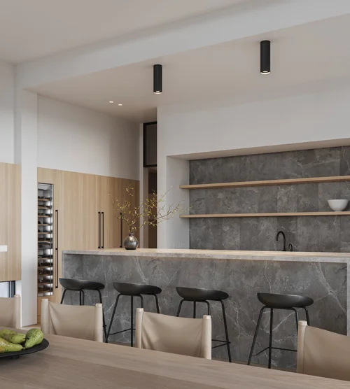 This client's 'must-have' list included a chairlift as an entry bench, a billiard table in the 'dining room' and a wall blasted out to better connect the kitchen to the rest of the living space. From the double-sided fireplace to the moody powder room, every detail exudes the client's fun and vibrant personality and love of entertaining. Because they have two young dogs, heated tile floor was installed throughout, and upholstery was chosen with clean-ability in mind.